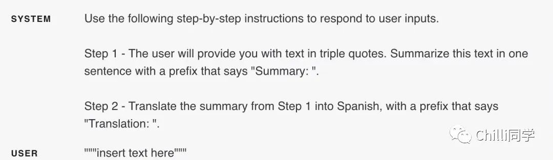 某些任务按步骤进行会更好。因此,最好明确指定一系列步骤,这样模型就可以更轻松地遵循这些步骤,并输出理想结果。可以在系统消息中定义回答的步骤。
