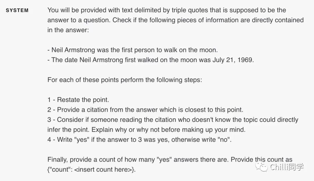 如果答案中包含了已提供的事实,模型将回答"是"。反之,它将回答"否"。最后,模型将统计有多少个"是"的答案: