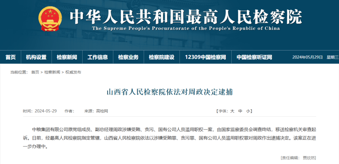 5月29日,最高检官网显示,中粮集团有限公司原党组成员、副总经理周政涉嫌受贿、贪污、国有公司人员滥用职权一案,由国家监察委员会调查终结,移送检察机关审查起诉。