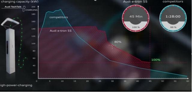 e-tron这套电池包150kW的极限充电功率虽然不是豪华品牌中最高的,但是通过在相当大的SOC范围内(0-70%)维持150kW峰值功率充电,相对比大部分峰值功率更高但是只能在40%SOC以内维持峰值功率的品牌最终0-100%的充电时间更短。